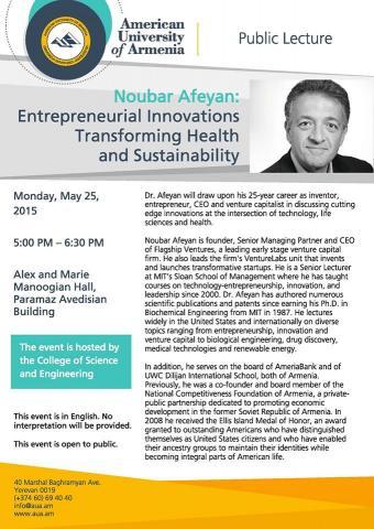Dr. Afeyan will draw upon his 25-year career as inventor, entrepreneur, CEO and venture capitalist in discussing cutting edge innovations at the intersection of technology, life sciences and health.